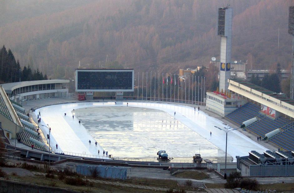 Medeo ice skating rink in the mountains outside of Almaty, Kazakhstan, October 2004, very "fast ice" for professional speed skaters and a popular destination for locals.