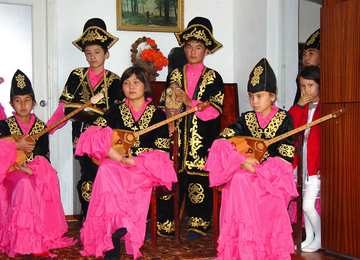 Dressed in traditional costumes, children perform in the remote village of Zhobagly in south Kazakhstan. Picture taken 2004.