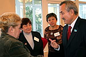 Serik Abdrakhmanov (right), Deputy of Kazakhstan's lower chamber of Parliament discusses with conference participants ways to develop local self-government in Kazakhstan, Almaty, 15 November 2006.