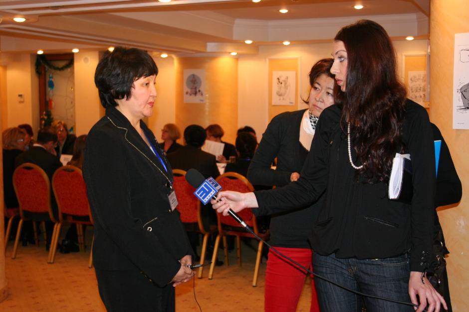 Rashida Naubetova, Chief Supervisor of the National Commission on Family Issues and Gender Policy under the President, gives an interview to journalists, Astana, 7 December 2007.