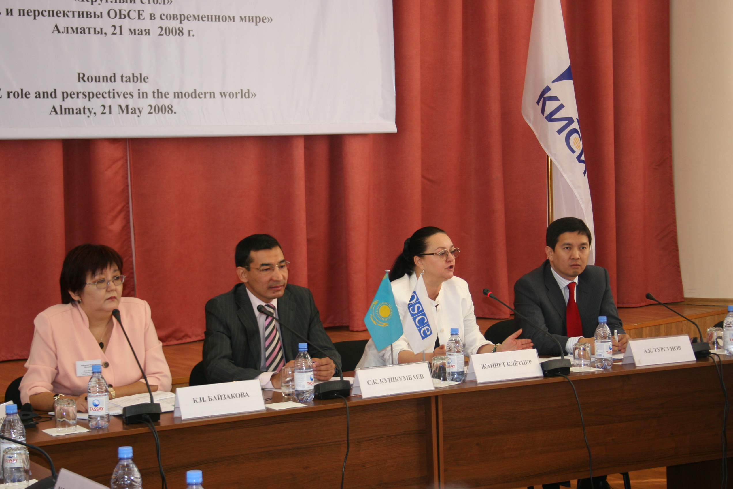 Jeannette Kloetzer (centre), Deputy Head of the OSCE Centre in Astana, addresses participants at a roundtable on the OSCE in Almaty, 21 May 2008.