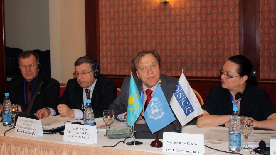 L-r: Vladimir Borisov, Judge of the Supreme Court of Kazakhstan and Chair of the National Union of Judges, Anatoliy Dernovoy, the Executive Secretary of the Ministry of Environmental Protection of Kazakhstan, Jan Darpo, Chair of the Task Force on Access to Justice under the Aarhus Convention, and Jeannette Kloetzer, the Deputy Head of the OSCE Centre in Astana, during a conference on the Aarhus Convention, Almaty, 22 May 2012.