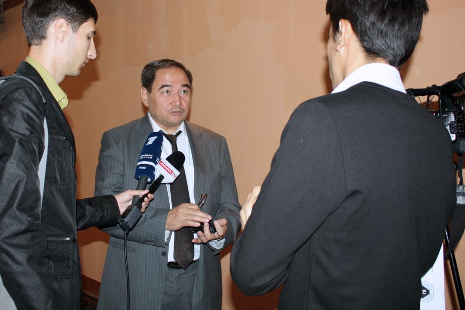 Supreme Court Judge Tolabay Kozhan speaks to journalists about problems in identifying trafficking victims, Astana, 29 August 2012.