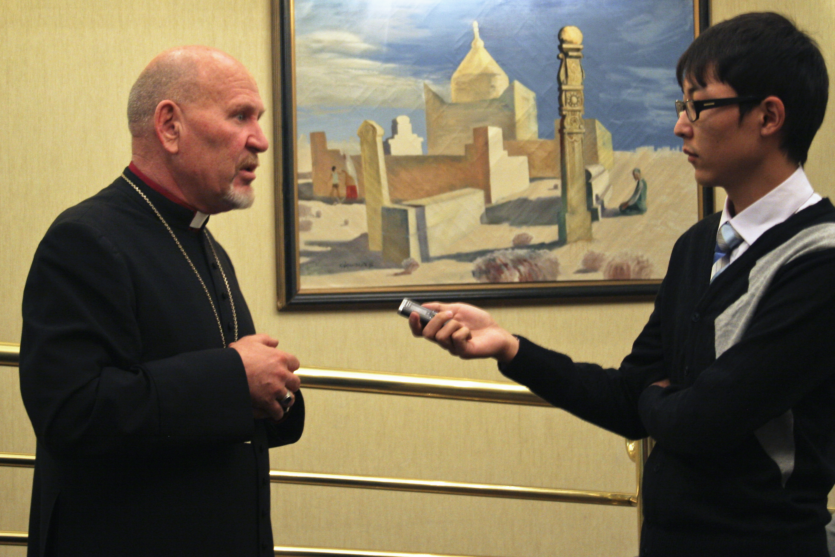 Bishop Yuri Novgorodov of the Evangelical Lutheran Church in Kazakhstan gives an interview at an OSCE-supported roundtable meeting on the implementation of the law on religious activity and religious organizations, Almaty, 12 October 2012.
