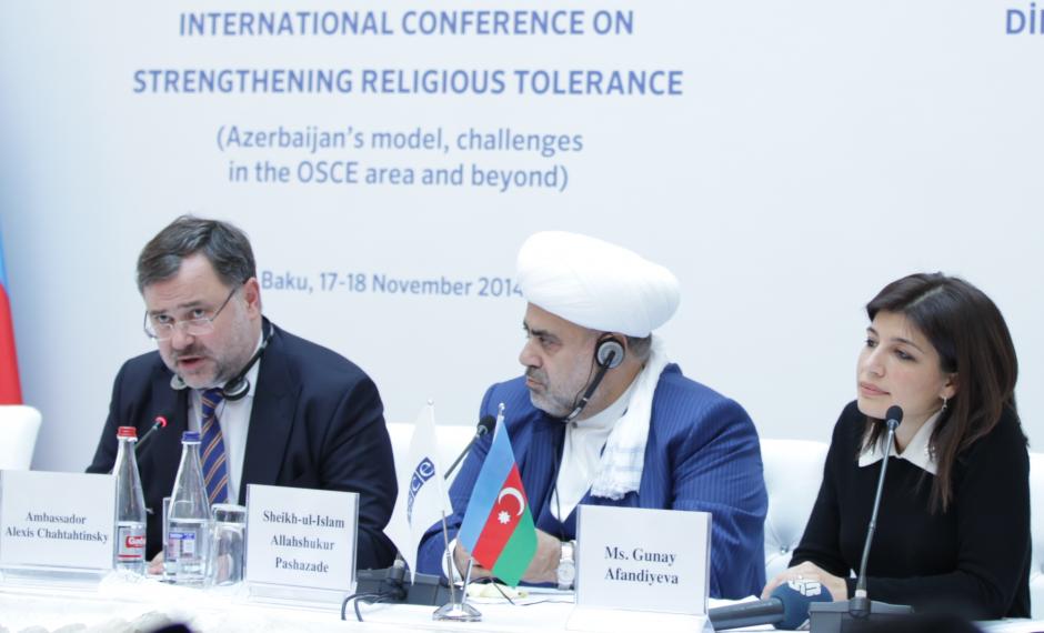 L-r Ambassador Alexis Chahtahtinsky, OSCE Project Co-ordinator in Baku, Sheikh-ul-Islam Allahshukur Pashazade, Chairman of the Caucasus Muslims Boards, and Gunay Efendiyeva, Secretary General of the National Commission of Azerbaijan for UNESCO, during a closing ceremony of the International Conference on Strengthening Religious Tolerance, Baku, 18 November 2014
