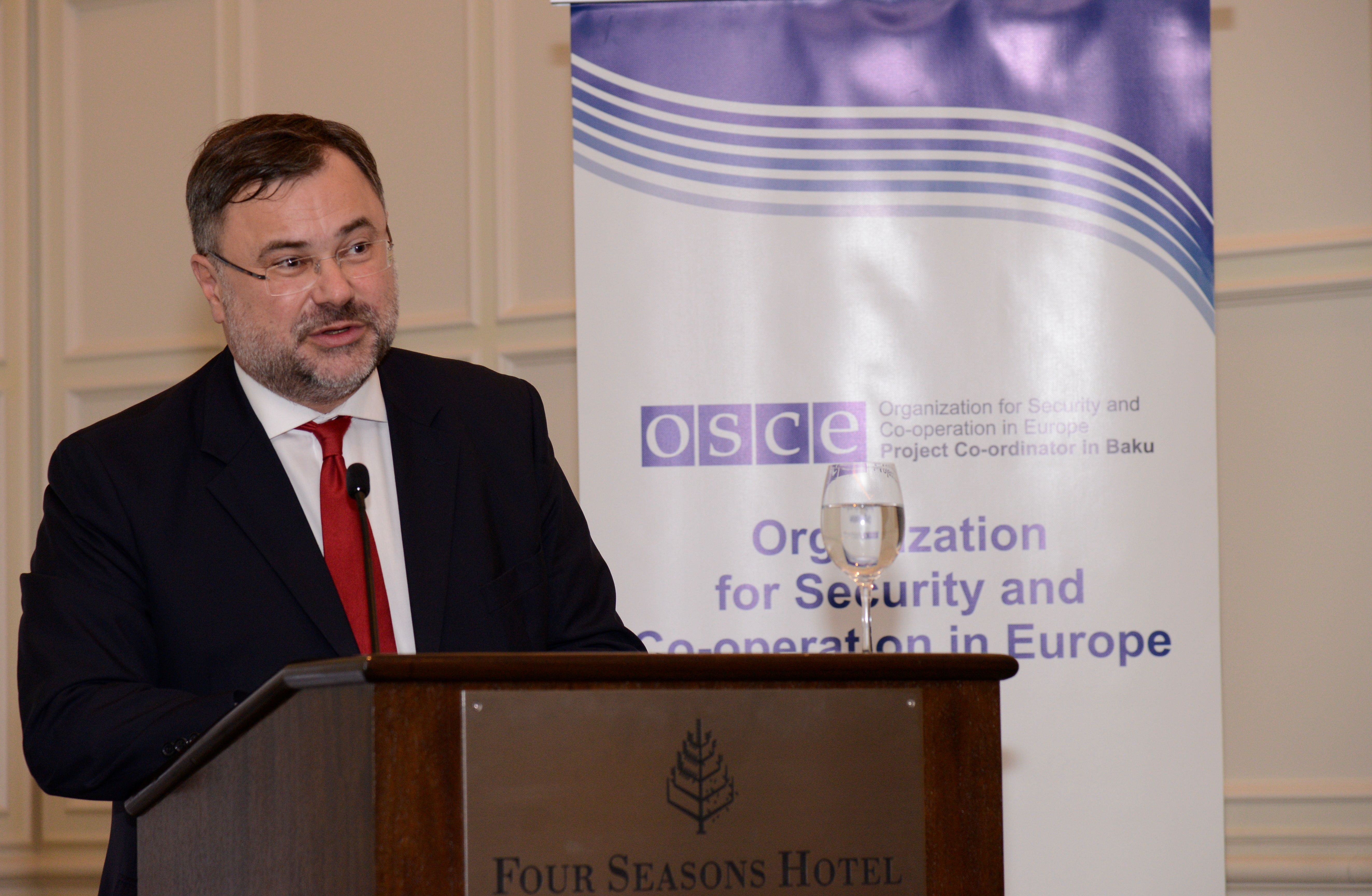 Ambassador Alexis Chahtahtinsky, OSCE Project Co-ordinator in Baku, speaks at the signing ceremony of a Declaration on support for combating human trafficking in Azerbaijan, Baku, 20 November 2014.