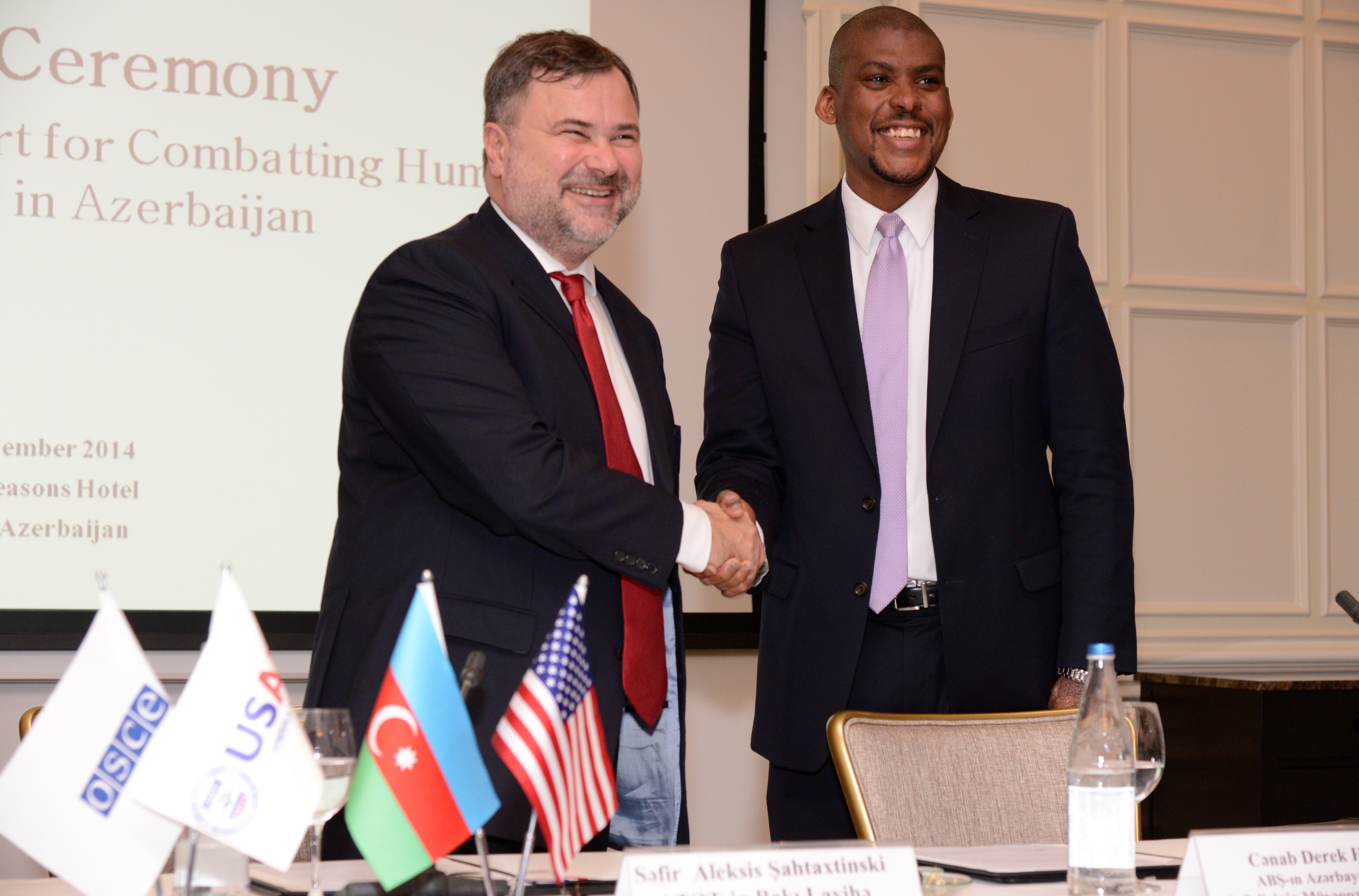 L-r Ambassador Alexis Chahtahtinsky, the OSCE Project Co-ordinator in Baku, and Dereck Hogan, Chargé d’Affaires of the U.S. Embassy in Baku, signed a Declaration to co-operate on and support combating human trafficking in Azerbaijan, Baku, 20 November 2014.