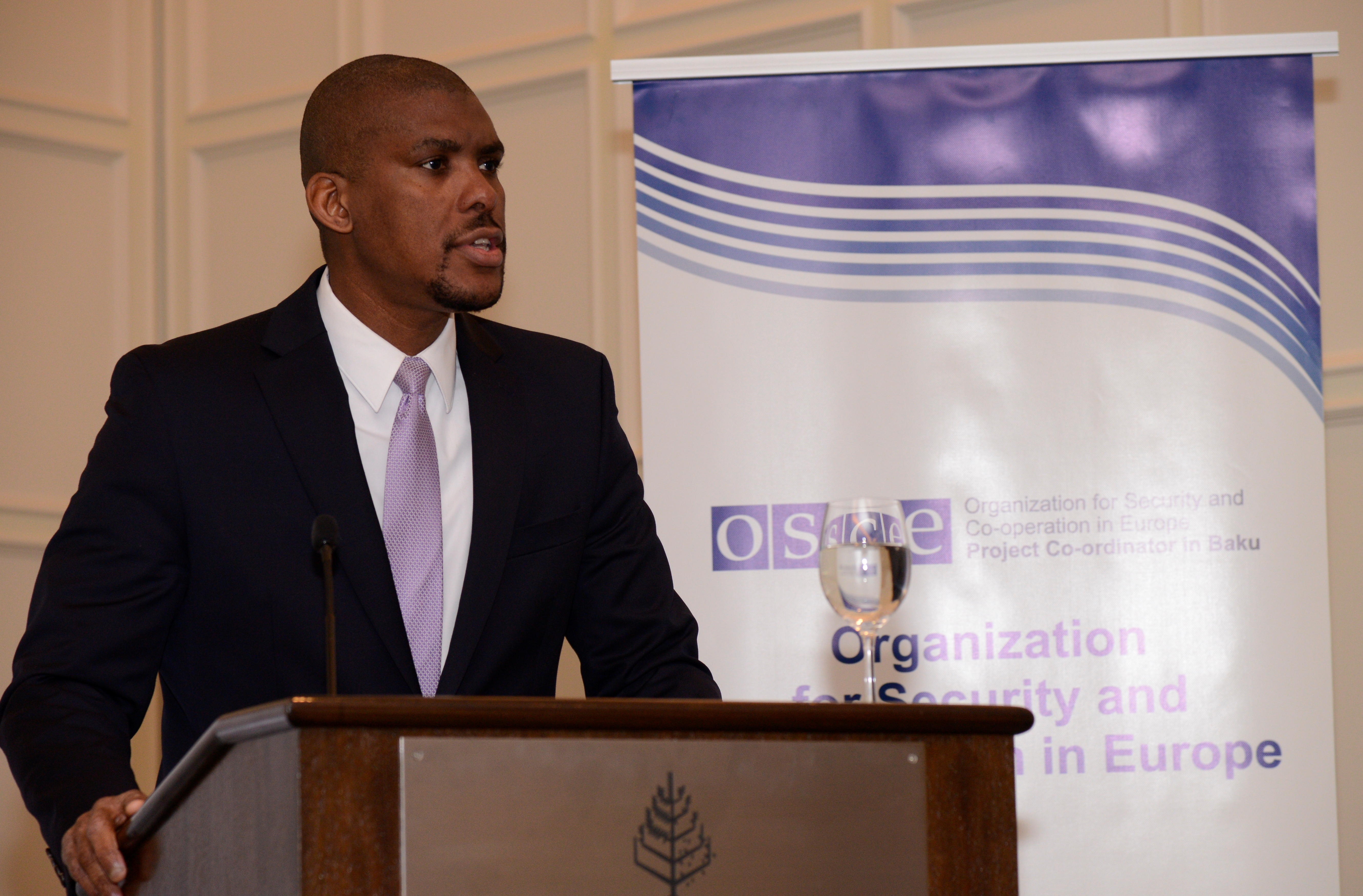 Dereck Hogan, Chargé d’Affaires of the U.S. Embassy in Baku, speaks at a signing ceremony of a Declaration on support for combating human trafficking in Azerbaijan, Baku, 20 November 2014.
