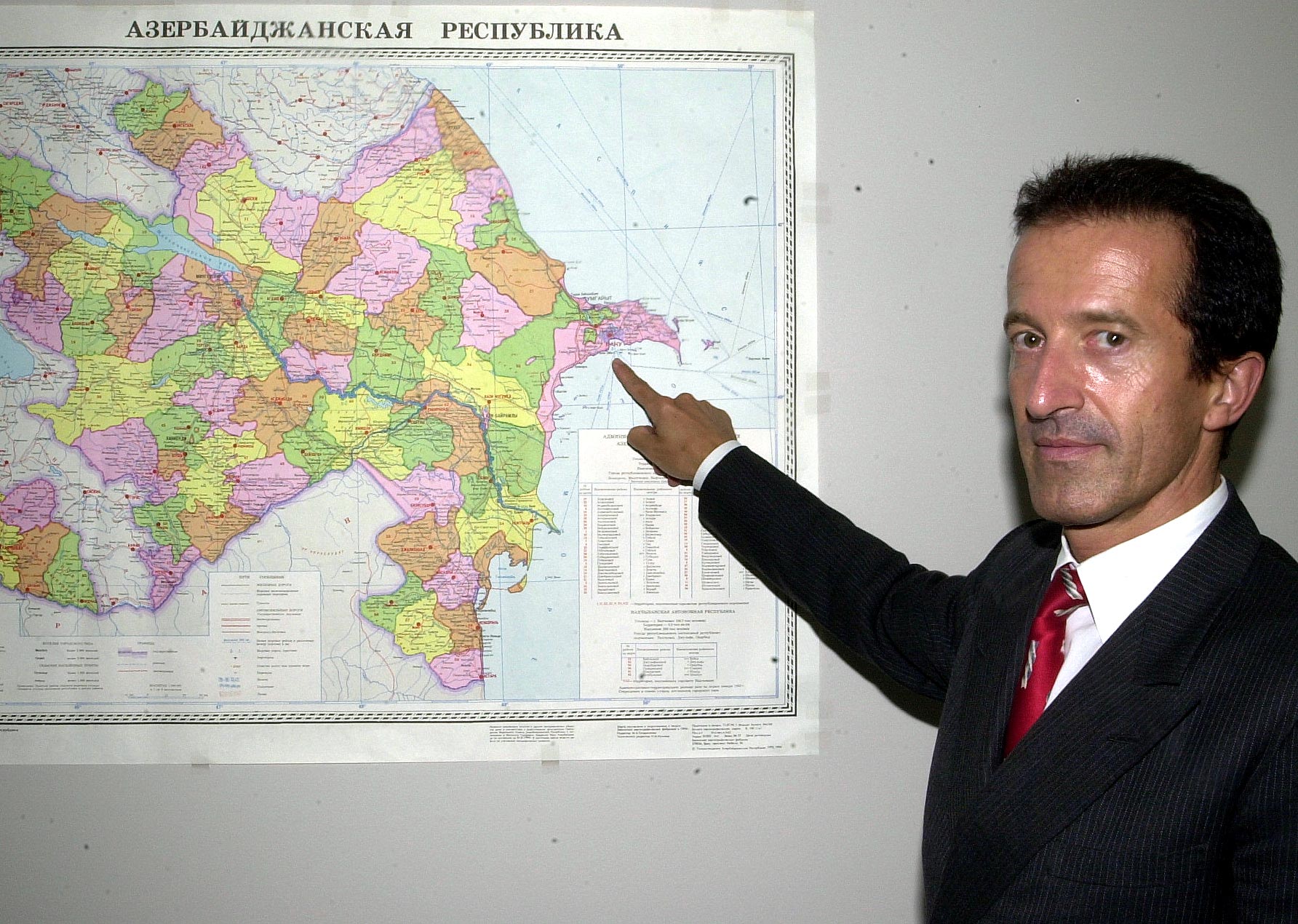 The Head of the OSCE Office in Baku, Ambassador Peter Burkhard, in front of a map of Azerbaijan.