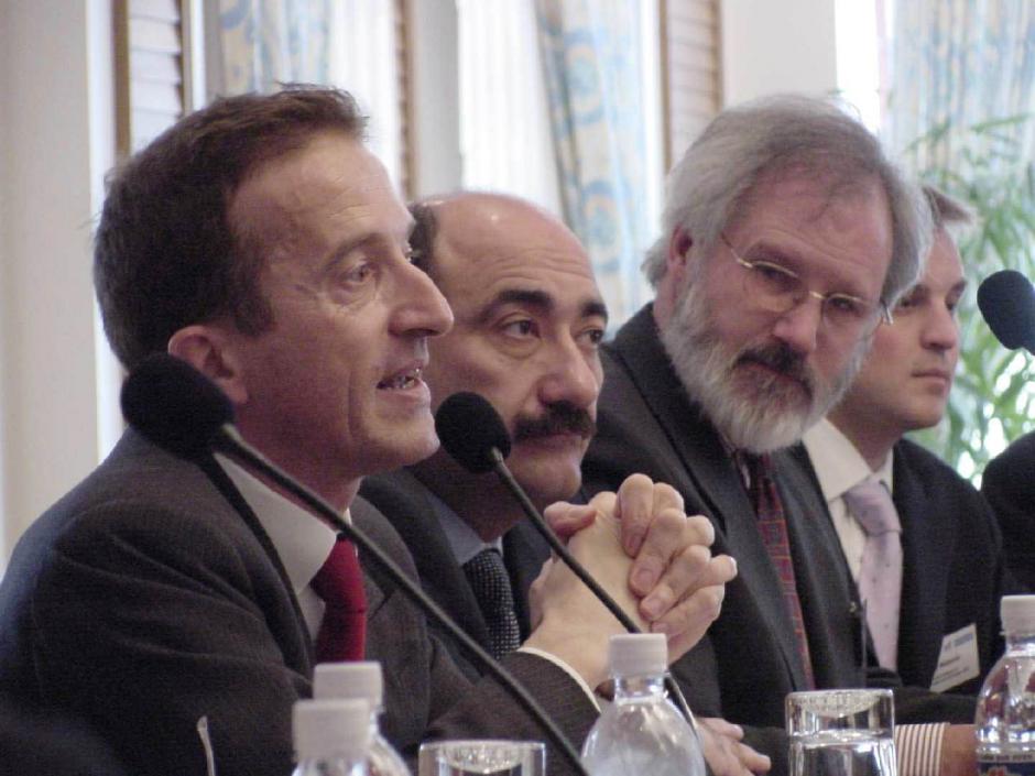 Amb. Peter Burkhard (left), Head of OSCE Centre in Baku, speaks at an eco-tourism conference in Baku, 15 April 2004. Azerbaijan's Minister of Youth, Sport and Tourism, Abulfaz Qarayev (centre) and University of Kent Prof. Nigel Leader-Williams look on.
