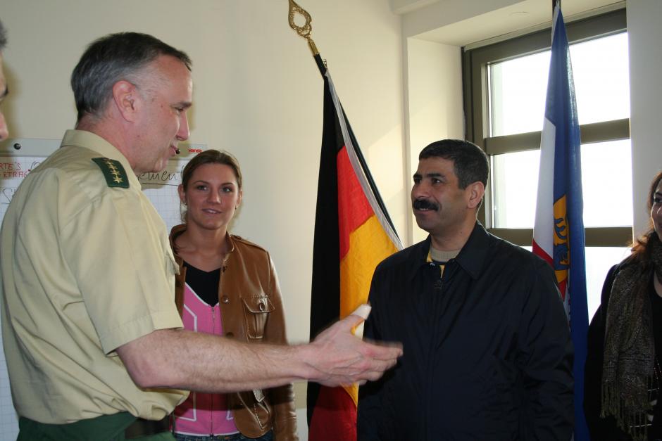 During a study tour to Germany to learn about best practices in public event management, General Zakir Hasanov (right), Commander of Azerbaijan's Internal Troops, is briefed at police headquarters in Luebeck, 31 March 2007.