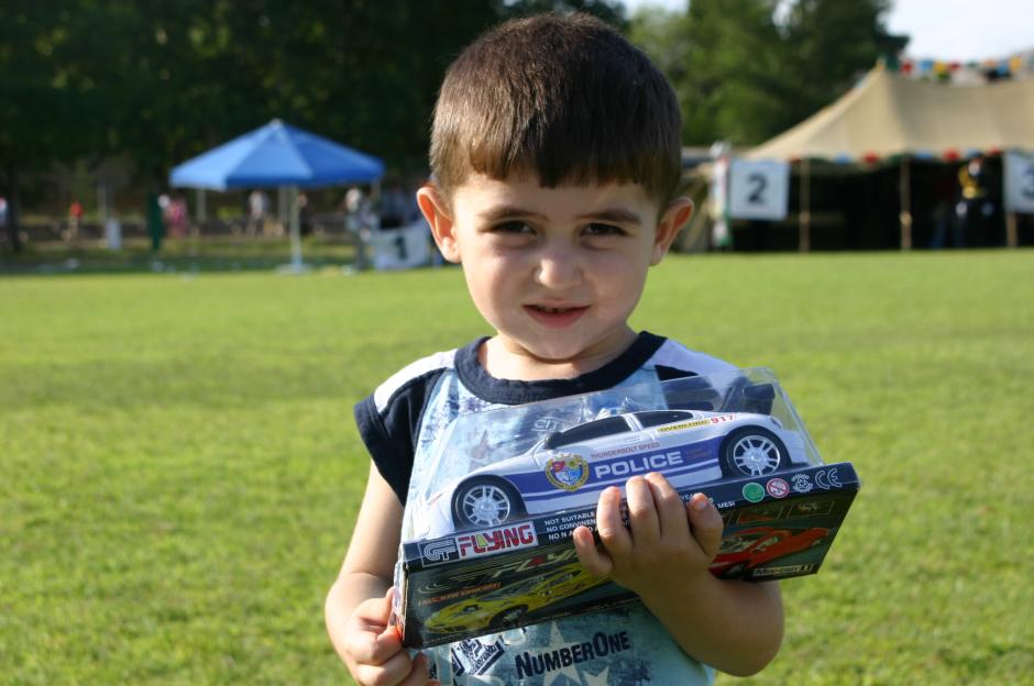 A child holds up a toy police car at a Police Open Day, Mingechevir, 30 June 2007. The OSCE Office in Baku is working with Azerbaijan's Government to build trust between police and the communities they serve.