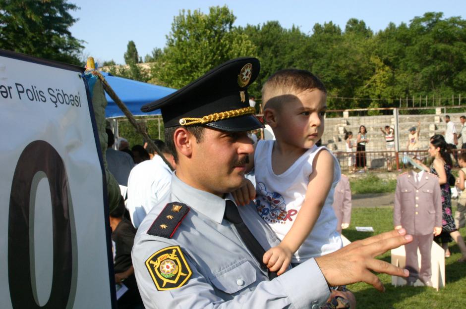 A police officer and his son watch the demonstrations on Police Open Day in Mingechevir, 30 June 2007. Through the Police Assistance programme, the OSCE Office in Baku assists Azerbaijan in building a more professional police force.