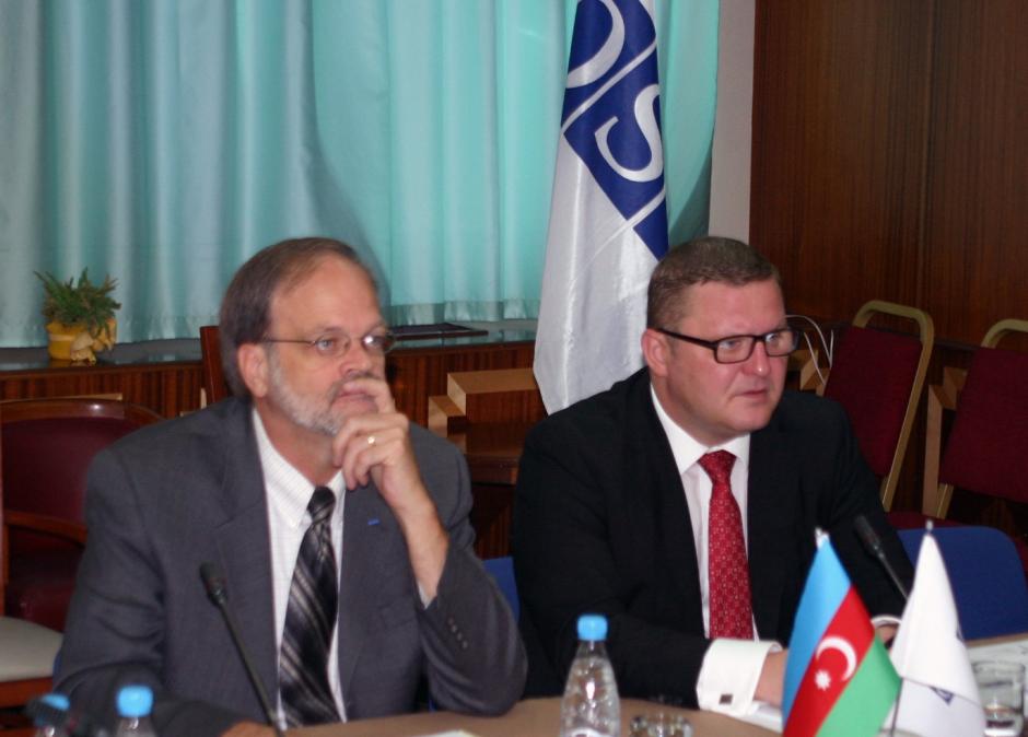 Soldan-sağa: ATƏT-in Bakı Ofisinin Siyasi-Hərbi Şöbəsinin rəhbəri Con MakQreqor və Ofisin Baş Polis Experti Marko Kubni kibercinayətə qarşı mübarizəyə həsr olunmuş milli ekspert konfransında, Bakı, 6 Oktyabr 2011