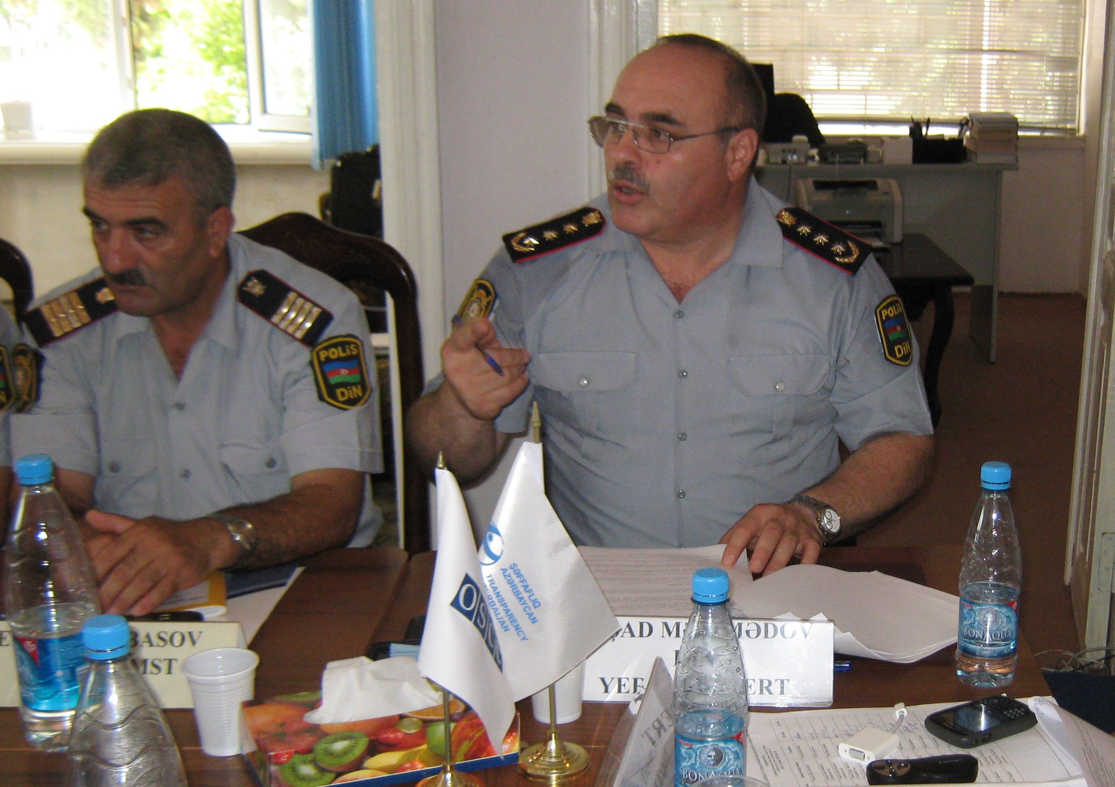 Elshad Mammadov (l), an expert from the Azerbaijan's Interior Ministry, at a training course for police officers on the treatment of suspects and the accused in custody, Lankaran, 10 July 2012.