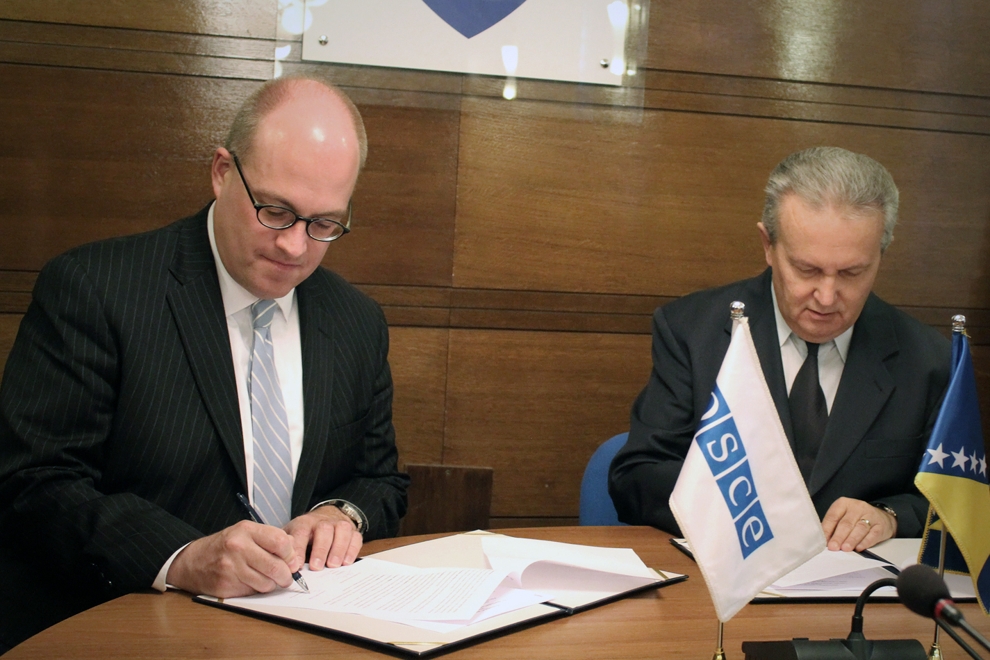 (R-l) Stjepan Mikic, President of the Central Election Commission of BiH, and Ambassador Jonathan Moore, Head of the OSCE Mission to BiH OSCE, sign a Memorandum of Understanding, Sarajevo, 25 September 2014.
