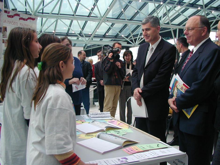 Ambassador Beecroft (right) and Dragan Covic, member of BiH Presidency, talk to participants in the Fourth Education Forum in Sarajevo, 15 November 2003.