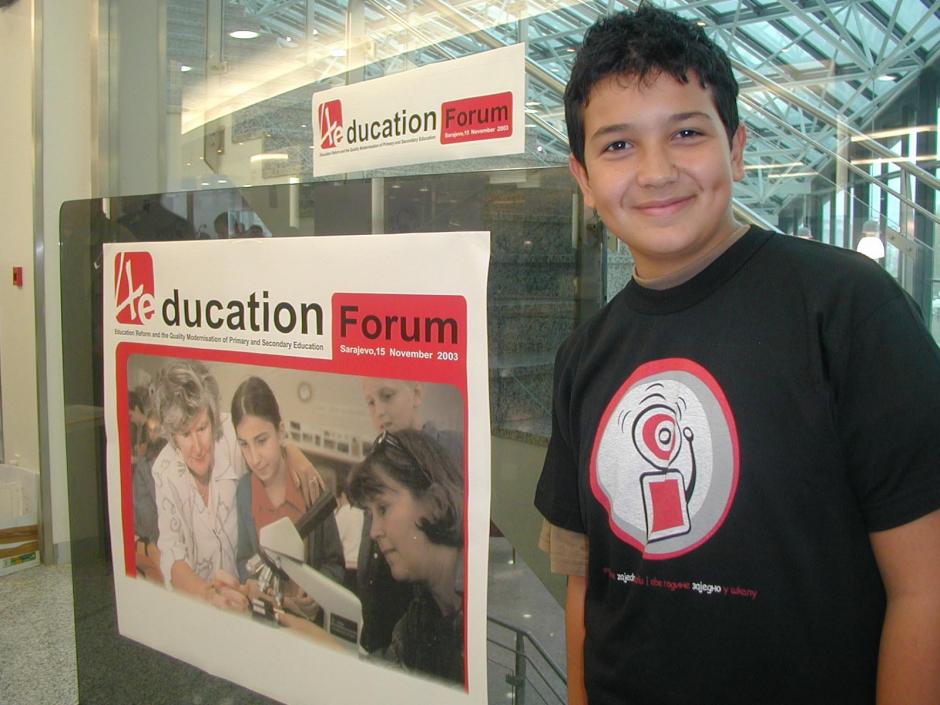 Dino, a student from Dzemaludin Causevic primary school, as a host at the Fourth Education Forum in Sarajevo, 15 November 2003.