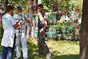 Volunteers taking part in an OSCE action to improve waste management in Drvar, collect litter and bring attention to the problem by stringing up what they have gathered, Bosnia and Herzegovina, October 2004.