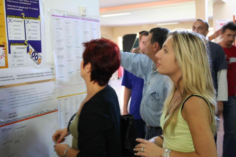Voters study election lists at their polling station in Sarajevo during the 1 October 2006 general elections in Bosnia and Herzegovina.