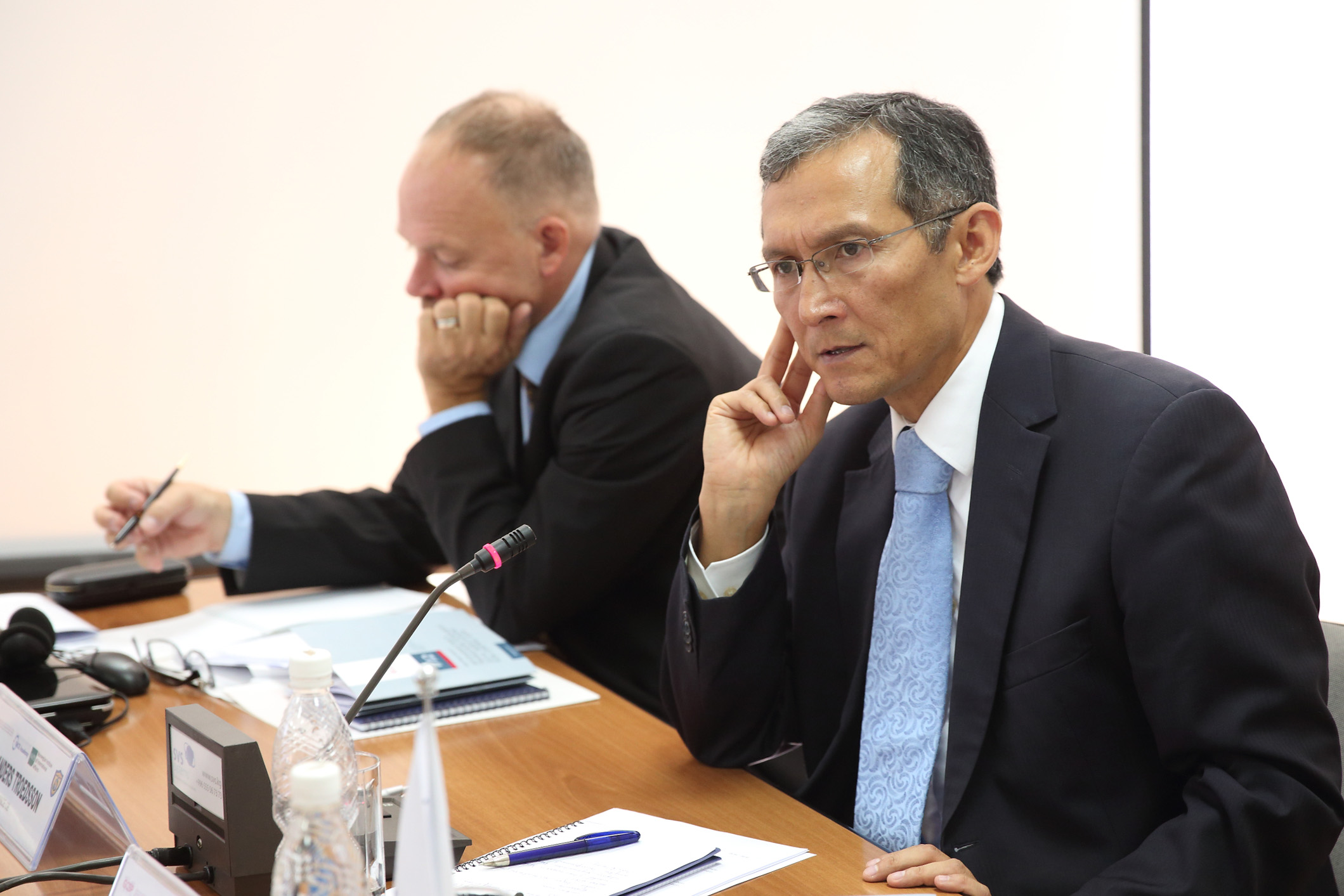 Djoomart Otorbaev (r), First Vice Prime Minister of Kyrgyzstan, alongside Anders Troedsson, the Deputy Head of the OSCE Centre in Bishkek, at an OSCE-supported seminar on regional security in Central Asia at the OSCE Academy, Bishkek, 6 September 2013.
