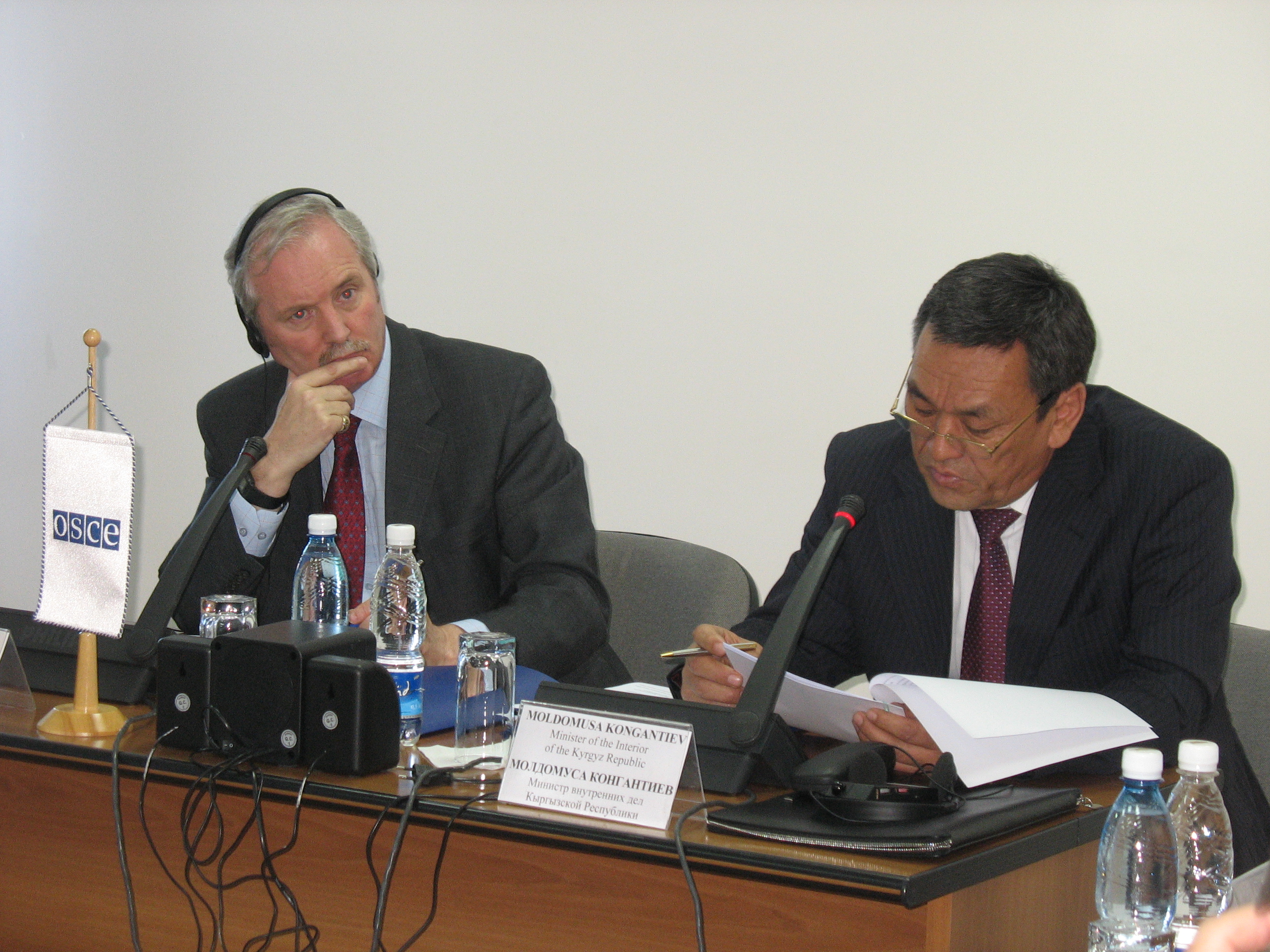 Ambassador Andrew Tesoriere (left), Head of the OSCE Centre in Bishkek, listens as Kyrgyzstan's Interior Minister, Moldomusa Kongantiev, addresses a meeting on police reform, Bishkek, 26 May 2009.
