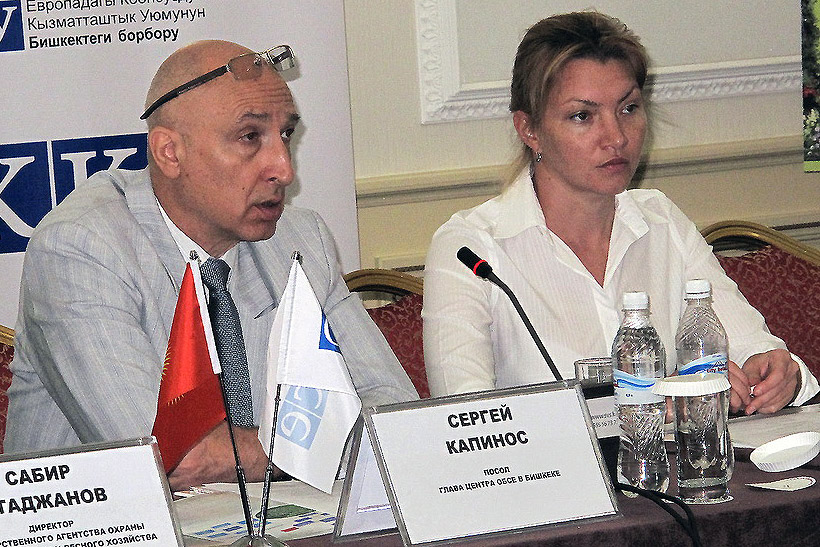 Yulia Minaeva, Senior Economic and Environmental Officer at the OSCE Centre in Bishkek (r) and Ambassador Sergey Kapinos, Centre's Head, speaking during an opening of the Aarhus Centre, Bishkek, 7 may 2015.