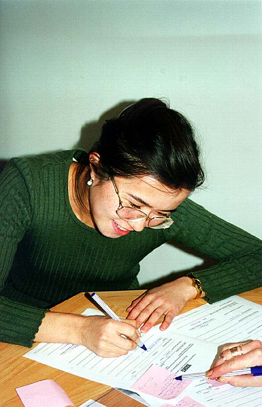 fills out the necessary forms at the Centre, November 2000.