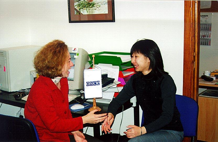 A staff member of the OSCE Centre is Bishkek, (left) interviews a