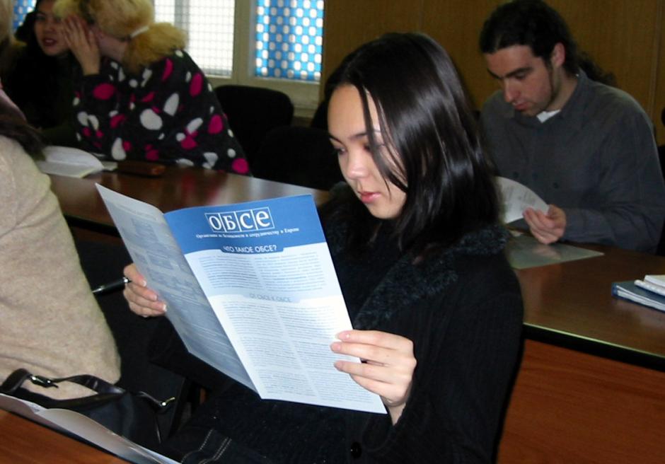 A Kyrgyz student reads an OSCE factsheet at the inauguration ceremony of the new OSCE Academy in Bishkek,