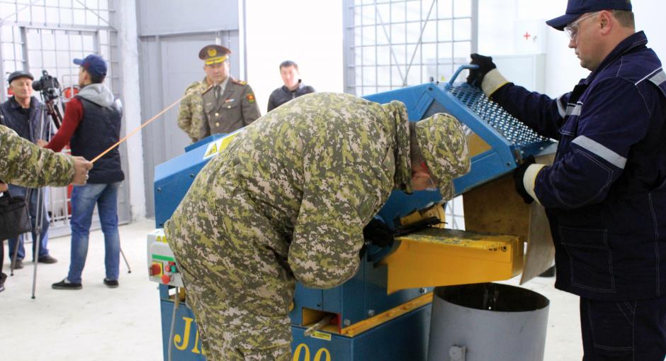 Kyrgyz military personnel demonstrate to donors the destruction of an unserviceable weapon using hydraulic shears.