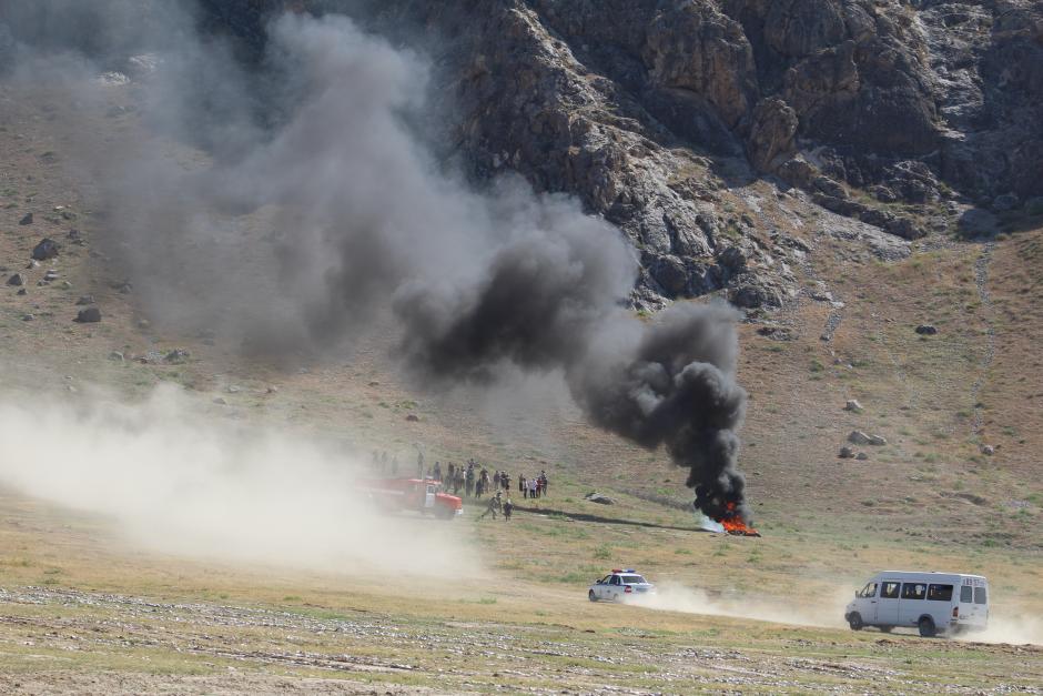 Emergency services rush to the scene of a fire during a simulation as part of the military Command-Staff Exercise ‘Barrier 2016’, Osh, 8 July 2016.