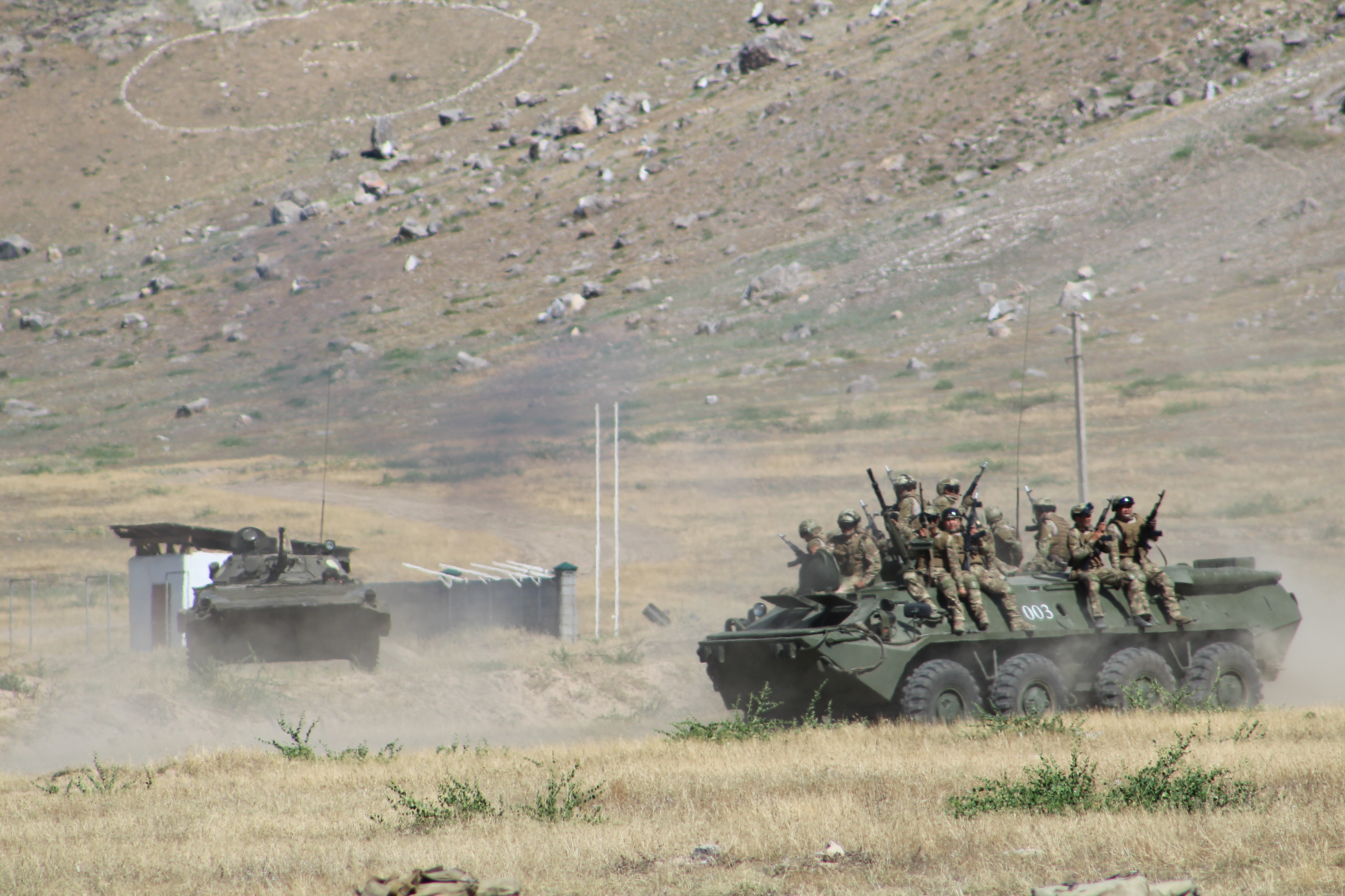 Soldiers of the Armed Forces of the Kyrgyz Republic sit on top of an armored personnel carrier during the military Command-Staff Exercise ‘Barrier 2016’, Osh, 8 July 2016.
