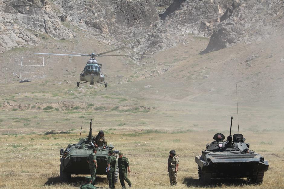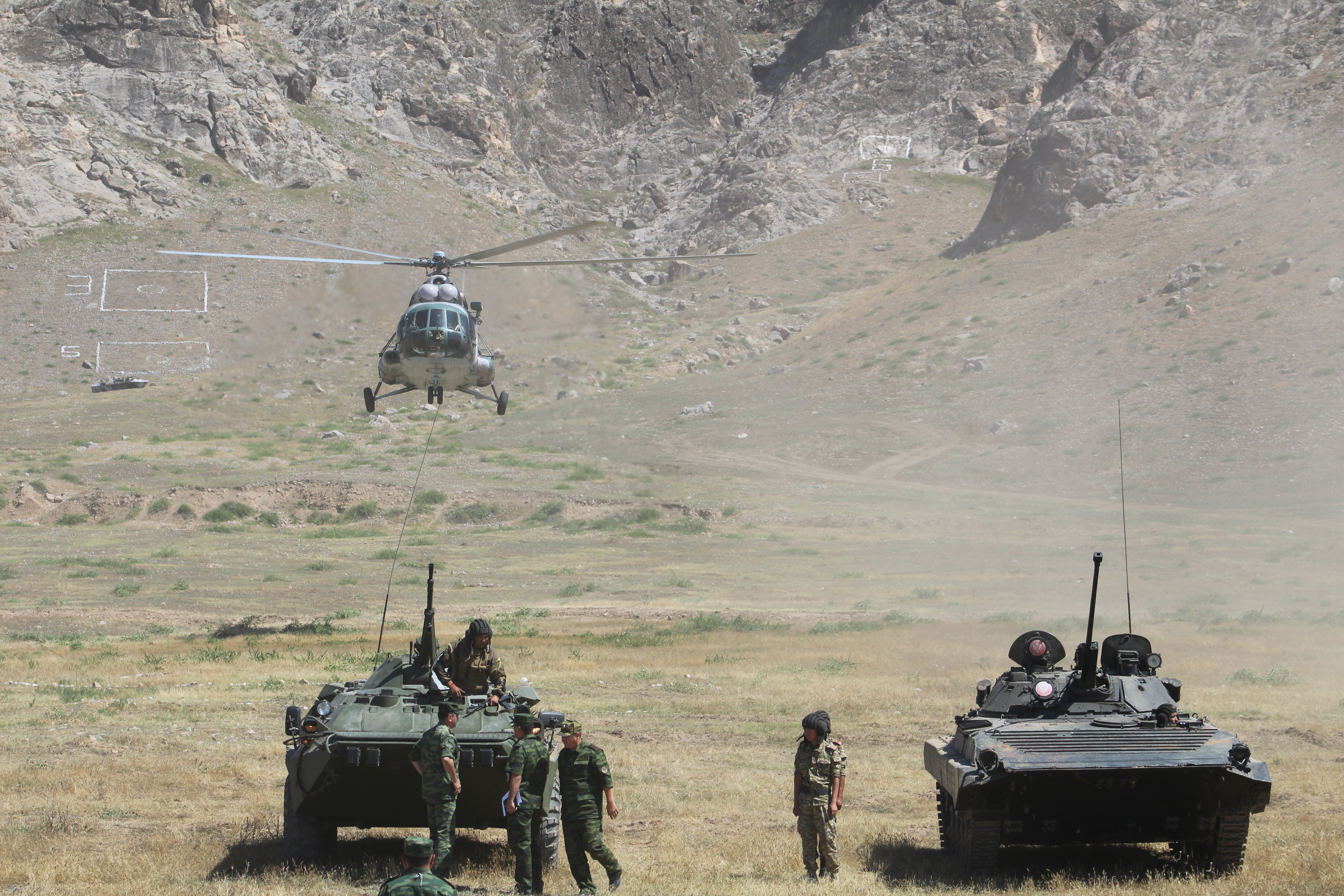 Assorted military vehicles and aircraft participating in the military Command-Staff Exercise ‘Barrier 2016’, Osh, 8 July 2016.