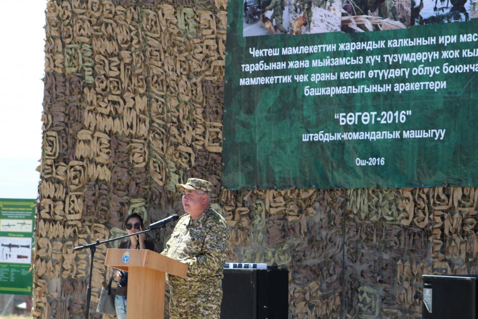 Deputy Head of the staff of the Armed Forces of the Kyrgyz Republic Major General Zakir Tilenov gives a speech during the military Command-Staff Exercise ‘Barrier 2016’, Osh, 8 July 2016.