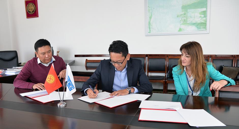 Kanat Joldoshev, Director of Programs of the International Republican Institute, Almaz Mambetov, Mayor of Balykchy and Nana Baramidze, Senior Economic and Environmental Officer of the OSCE Centre in Bishkek signing a Memorandum of Understanding to support a pilot project on improving municipal services delivery in the town of Balykchy. Issyk-Kul, 23 August 2016.