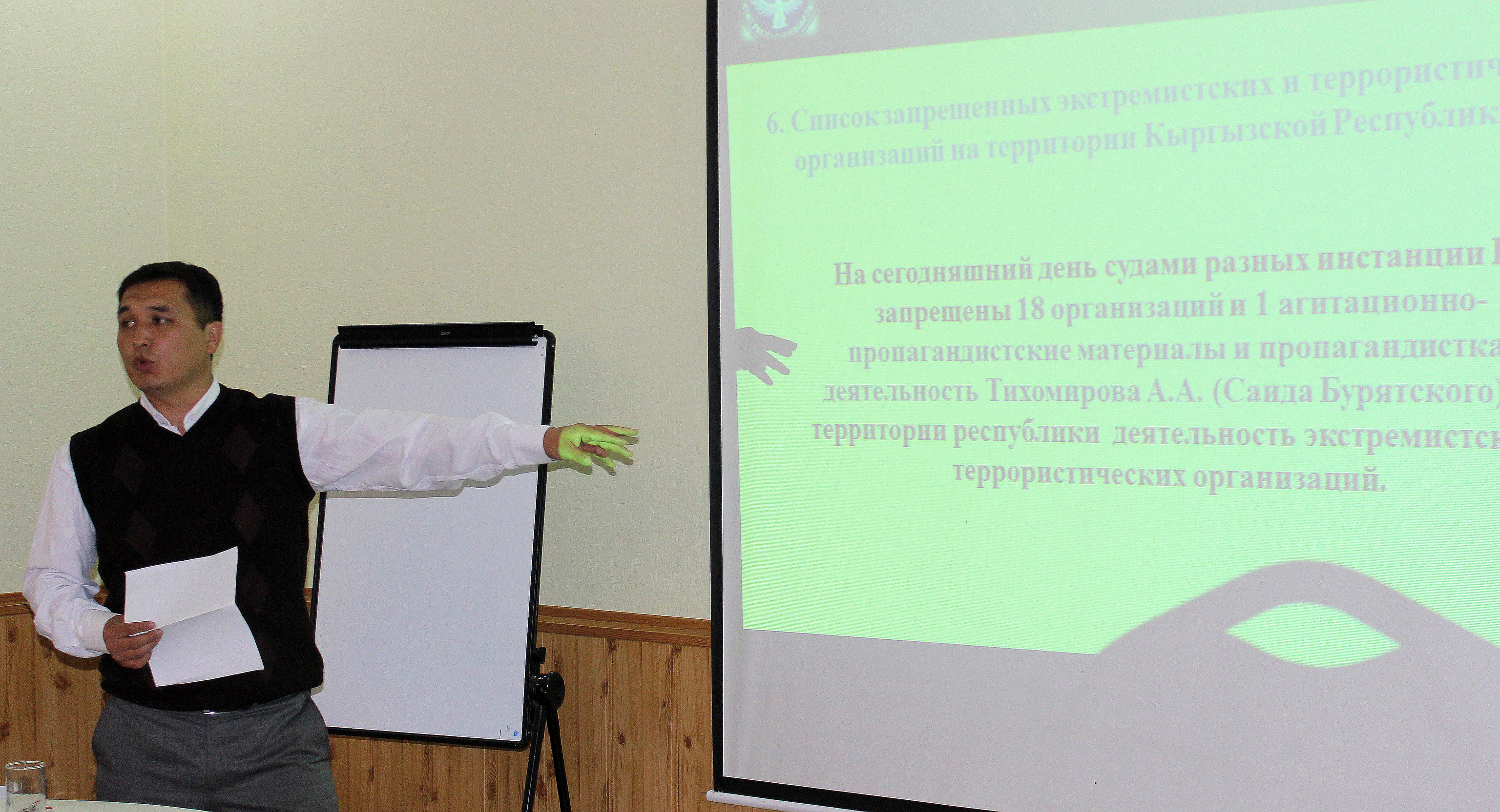 Manas Amanbaev, from the Interior Ministry of the Kyrgyz Republic is giving a lecture on legal framework to prevent VERLT. Osh, Kyrgyzstan, 22 October 2016.