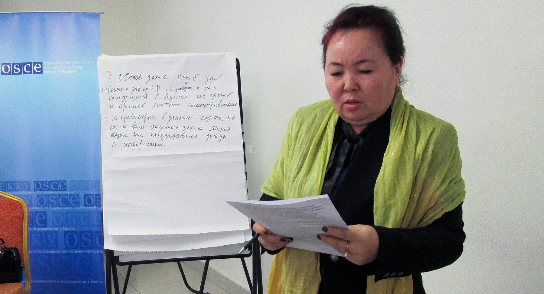 Gulzada Toktogulova, the judge of the Jalal-Abad provincial court is presenting the findings of the group work on the effective implementation of the Aarhus Convention. Osh, Kyrgyzstan, 4 November 2016.