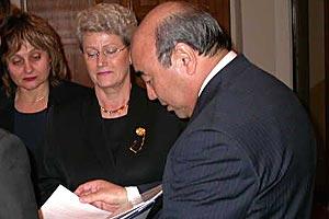 Kyrgyz President Askar Akaev and Paula Kokkonen, Head of an OSCE Parliamentary Assembly delegation, during a visit to Kyrgyzstan, 1 to 4 December 2002.