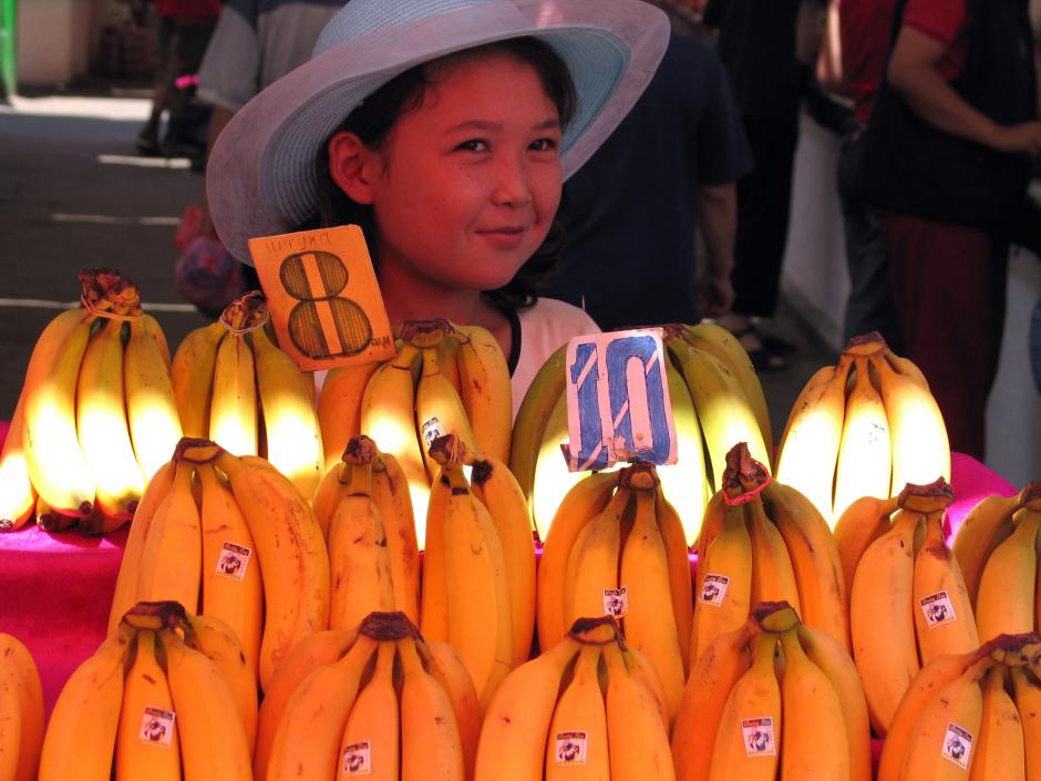 A young girl sits next to bananas up for sale at the market in Bishkek, June 2004.