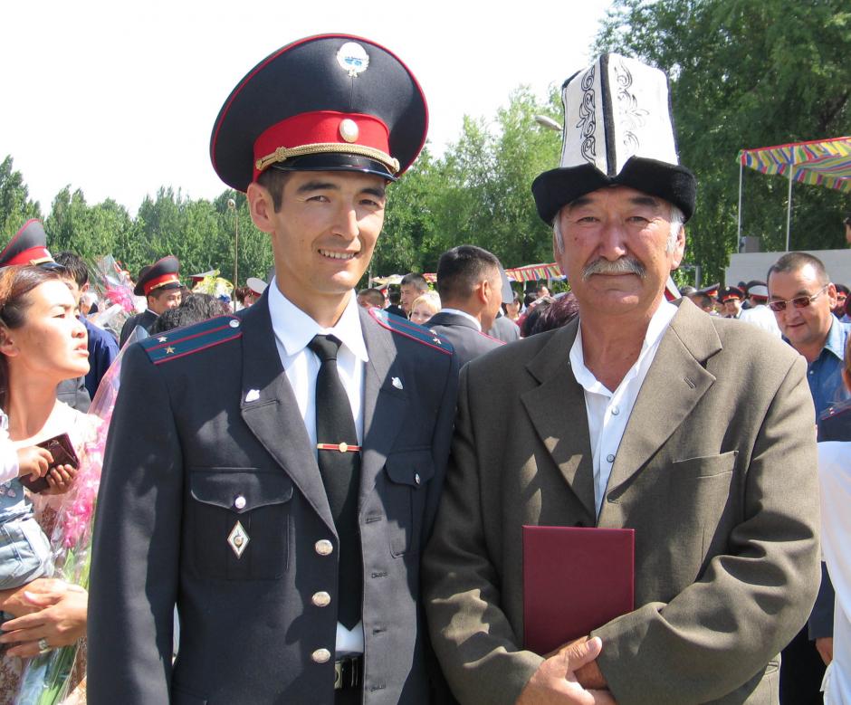 A cadet and his relative after a graduation ceremony at the Police Academy in Bishkek, 26 June 2004.