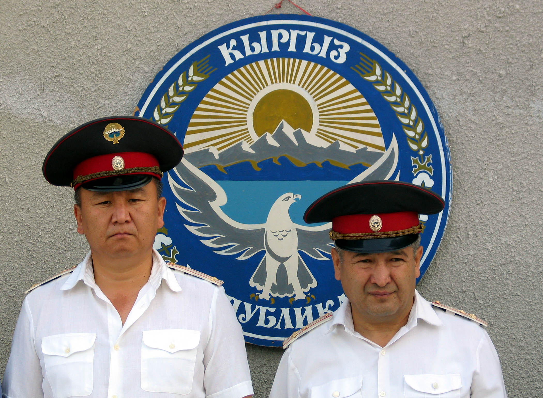 Policemen stand under the Kyrgyzstan coat of arms during a graduation ceremony at the Bishkek Police Academy, 26 June, 2004. The OSCE's Strategic Police Matters Unit builds up police capacity in several countries of the former Soviet Union.