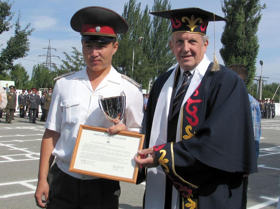 Richard Monk (right), OSCE Senior Police Adviser until January 2006, awards a cadet at a graduation ceremony at the Bishkek Police Academy, 26 June 2004. The OSCE's Police Matters Unit works in several countries of the former Soviet Union.