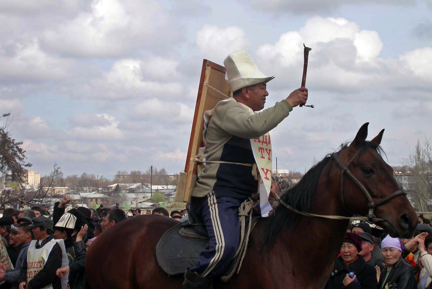 In Osh, 19 March 2005, a man on horseback takes part in protest actions against the results of Kyrgyzstan's parliamentary election of 13 March.