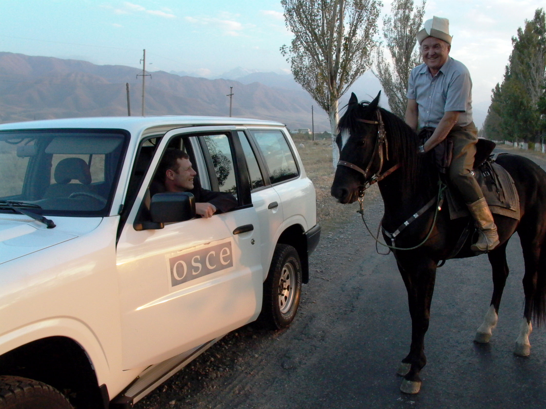 A Kyrgyz man on horseback talks to a driver from the OSCE Centre in Bishkek, 3 October 2005.