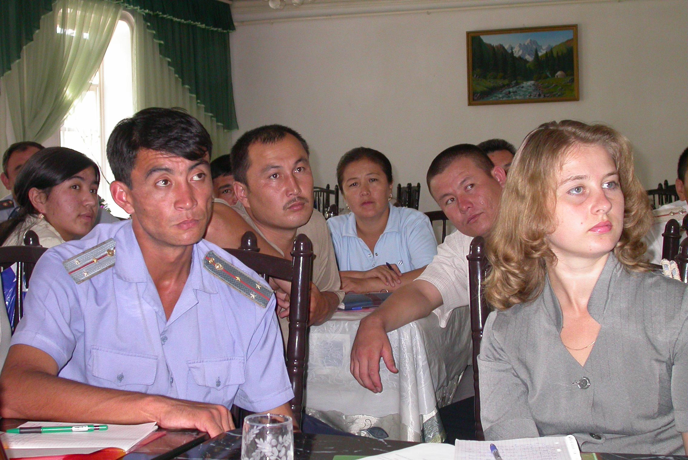 Police officers and local community representatives at a confidence-building meeting in the Nooken District of Jalalabat, Kyrgyzstan, organized by the OSCE Centre in Bishkek's Osh Field Office, 5 August 2005.