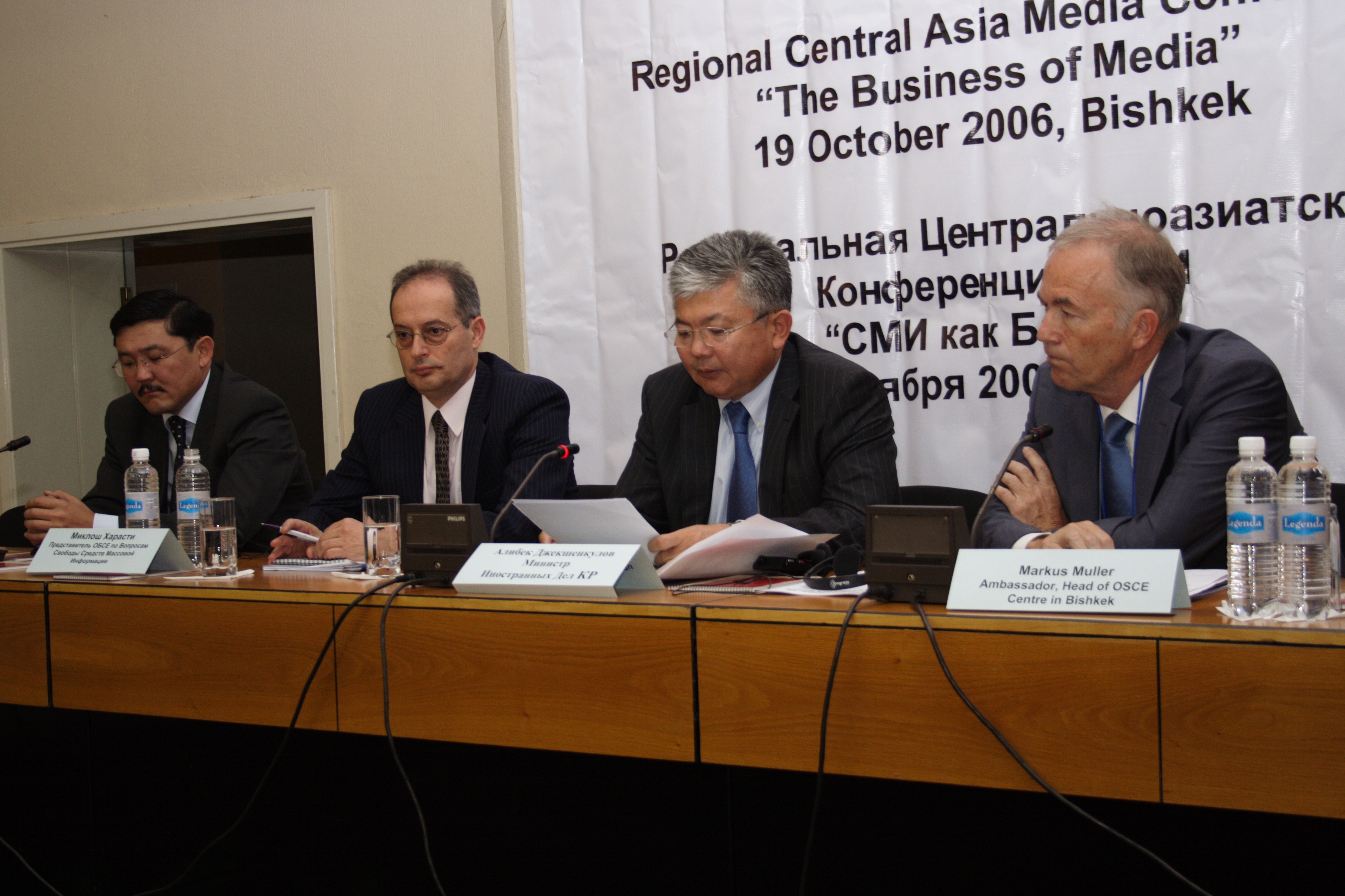 From left: OSCE Representative on Freedom of the Media, Miklos Haraszti; Kyrgyz Foreign Minister, Alibek Djekshenkulov, and Head of the OSCE Centre in Bishkek, Amb. Markus Mueller, at a conference on media privatization in Kyrgyzstan, 19 October 2006.