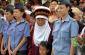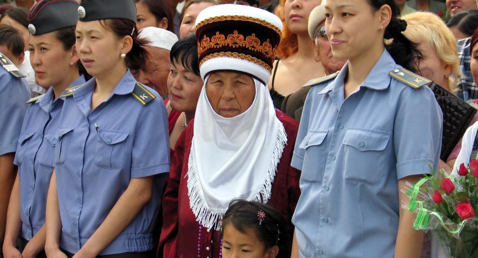 A woman in a traditional Kyrgyz costume watches the graduation ceremony at the Bishkek Police Academy, 26 June 2004. The OSCE's Strategic Police Matters Unit builds up police capacity in several CIS countries. (OSCE/Mikhail Evstafiev)