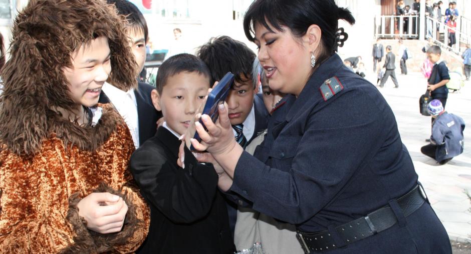 A forensic lab officer from Bishkek City Police shows children fingerprinting techniques during a police open day at a school in Bishkek, 10 April 2009. (OSCE/Ruslan Izmaylov)