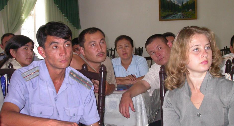 Police officers and local community representatives at a confidence-building meeting in the Nooken District of Jalalabat, Kyrgyzstan, organized by the OSCE Centre in Bishkek's Osh Field Office, 5 August 2005. (OSCE)